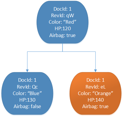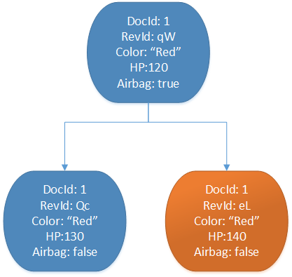Now we have a document with two different revisions in conflict, one with HP 130 and other with HP 140. We cannot pick any of these revisions as a winner one automatically, because we don’t have a meaningful way to know which one is the right one. We need the participation of the end user, maybe showing these conflict revisions in a GUI and letting the user pick one of them for us.